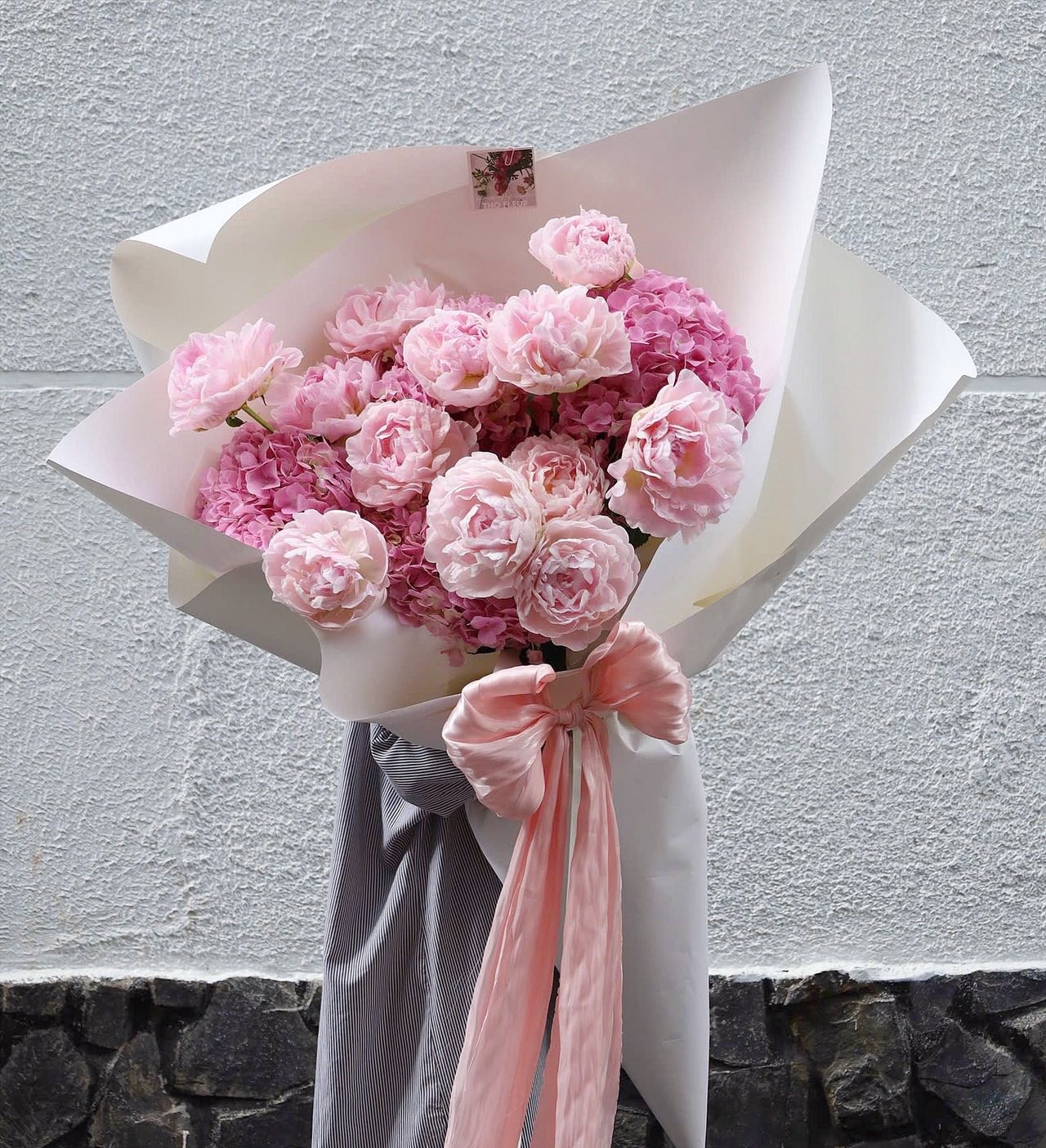 Một bản giao hưởng ngọt ngào của sắc hồng – nơi những cánh mẫu đơn bung nở như mây, nhẹ nhàng và mộng mơ, hoà quyện cùng cẩm tú cầu dịu dàng như một cái ôm ấm áp.Từng lớp hoa xếp xen kẽ, vừa mềm mại vừa chỉn chu, mang lại cảm giác như đang lắng nghe lời thì thầm của một trái tim đang rực rỡ trong bình yên.