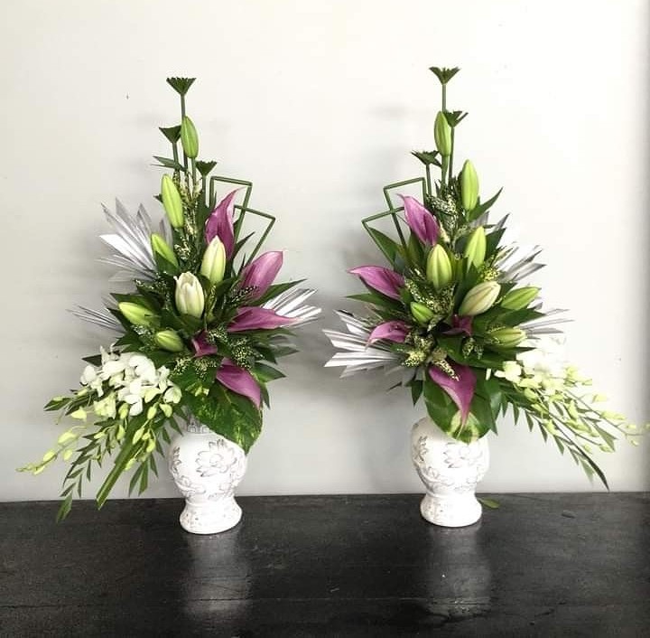 Cặp Hoa được thiết kế thanh nhã, cân đối, mang ý nghĩa dâng trọn lòng thành kính và sự tôn nghiêm. Sự kết hợp hài hòa giữa các sắc xanh – tím gợi cảm giác thanh tịnh, trang nghiêm, giúp không gian lễ thêm phần trang trọng và ấm cúng. Phù hợp để dâng lễ Phật, cúng đình – đền – chùa, hay đặt trong các buổi lễ tưởng niệm, cầu an, cầu siêu, thể hiện sự tôn kính và là lựa chọn giúp không gian thờ tự trở nên thanh tịnh và trang trọng hơn.