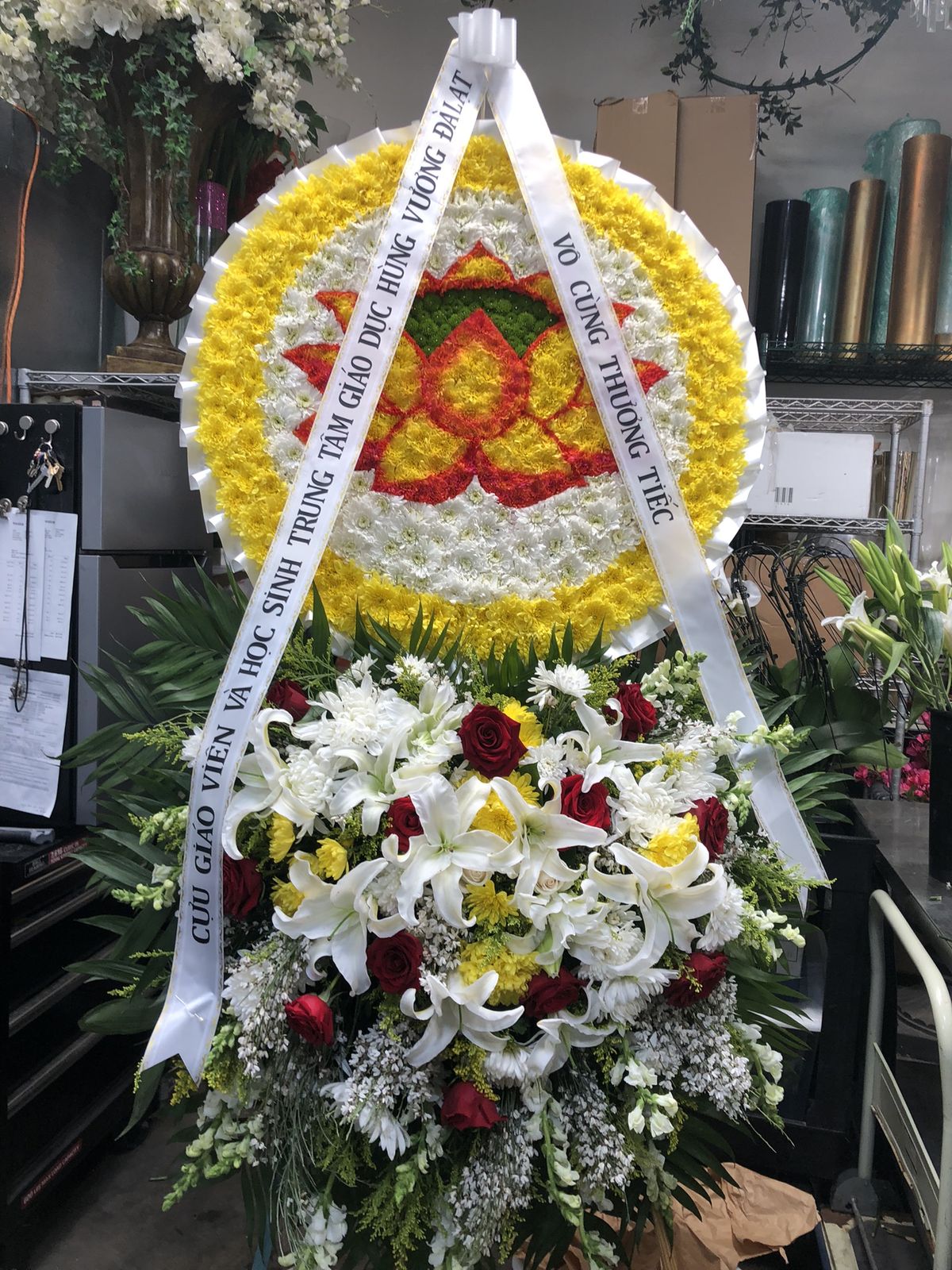 Vòng hoa tưởng niệm được thiết kế nổi bật với biểu tượng hoa sen – hình ảnh thanh khiết, biểu trưng cho sự giác ngộ và bình an trong Phật giáo. Đây là cách bày tỏ sự kính trọng, tưởng nhớ sâu sắc và gửi gắm lời cầu nguyện để người đã khuất được an lạc nơi cõi vĩnh hằng. Sự kết hợp hài hòa giữa sắc sen thanh tịnh và hoa tươi xung quanh tạo nên không gian lễ viếng trang nghiêm, thanh thản. Phù hợp cho lễ tang, lễ cầu siêu, lễ tưởng niệm theo nghi thức Phật giáo.