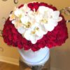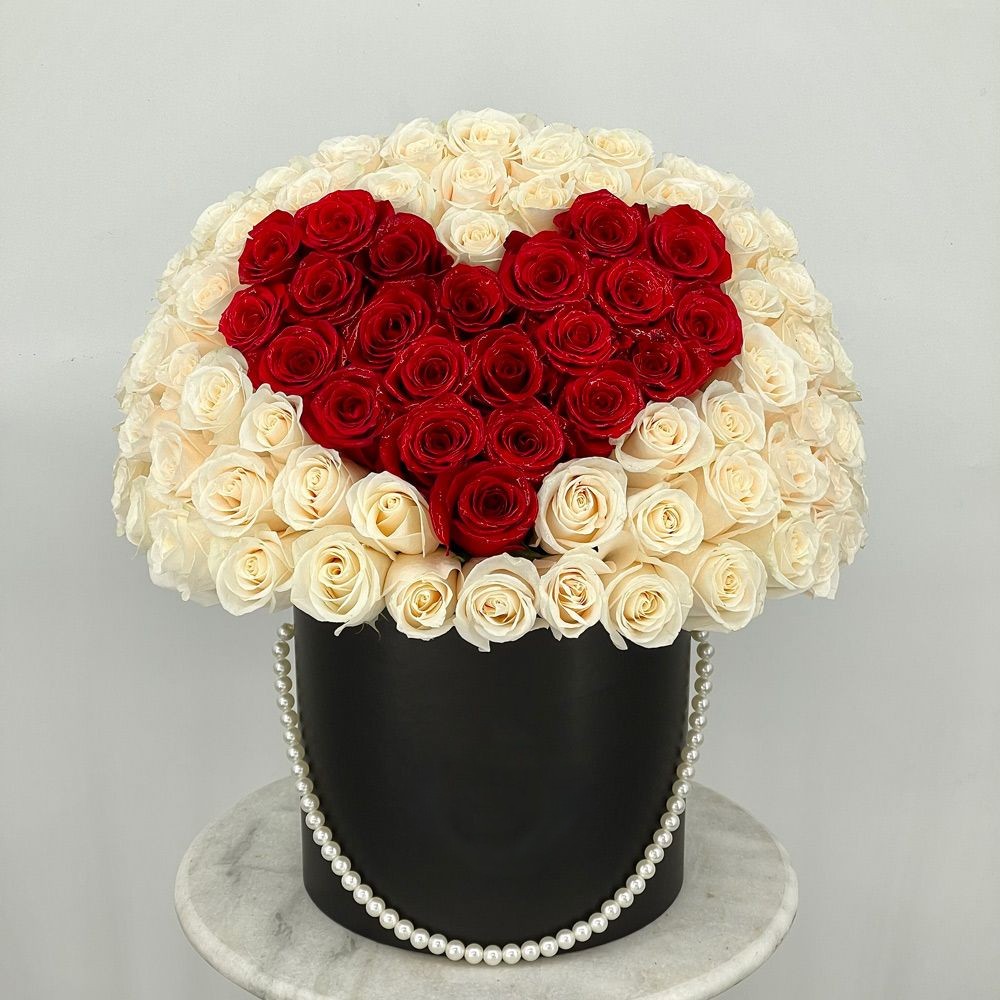 Hộp hoa sang trọng được kết hợp từ hàng trăm bông hồng trắng thanh khiết, điểm xuyết bằng những đóa hồng đỏ rực rỡ tạo thành hình trái tim đầy ấn tượng. Sự kết hợp tinh tế này không chỉ tôn lên vẻ đẹp kiêu sa, mà còn tượng trưng cho tình yêu, sự biết ơn và kính trọng sâu sắc.
