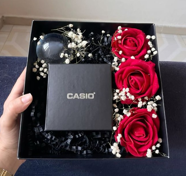 Hộp quà tinh tế gồm đồng hồ Casio chính hãng đặt trong hộp đen sang trọng, đi kèm hoa hồng đỏ và hoa baby trắng trang trí, tạo điểm nhấn lịch lãm và ấm áp. Đây là món quà ý nghĩa để tặng ba trong những dịp đặc biệt, gửi gắm sự trân trọng và lòng biết ơn đến người cha yêu thương. Phù hợp tặng trong các dịp: sinh nhật, kỷ niệm, Ngày của Cha, hay đơn giản chỉ để bày tỏ tình cảm chân thành.