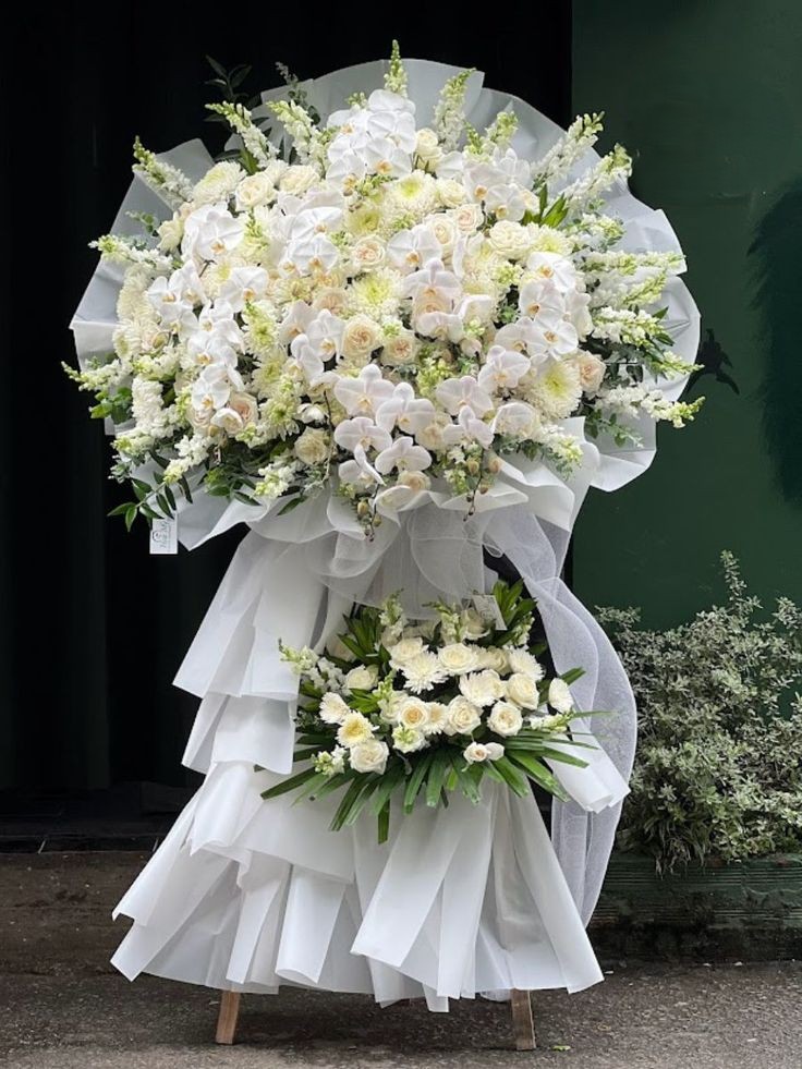Một kệ hoa trắng thuần khiết như lời chào cuối nhẹ nhàng và sâu lắng. Mỗi đóa lan, mỗi cánh hồng, mỗi cành cúc trắng là một nốt nhạc lặng – ngân lên giữa khoảng trời tiễn đưa. Không bi lụy, không phô trương – chỉ là một sự hiện diện đầy yêu thương, gửi gắm sự kính trọng và lòng biết ơn đến người đã đi xa.
