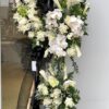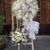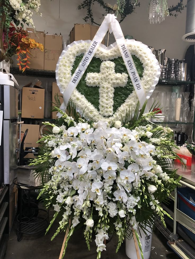 Mẫu hoa được thiết kế với sự trang trọng và tôn kính dành cho người theo Thiên Chúa giáo. Vòng hoa hình trái tim ôm trọn thánh giá trung tâm – biểu tượng thiêng liêng của đức tin và sự sống đời đời. Tầng hoa lan hồ điệp trắng thuần khiết kết hợp hoa hồng trắng và hoa phụ nhẹ nhàng, như lời tiễn đưa trong an lành, nguyện cầu linh hồn được yên nghỉ nơi vòng tay Chúa đầy yêu thương và phúc lành.