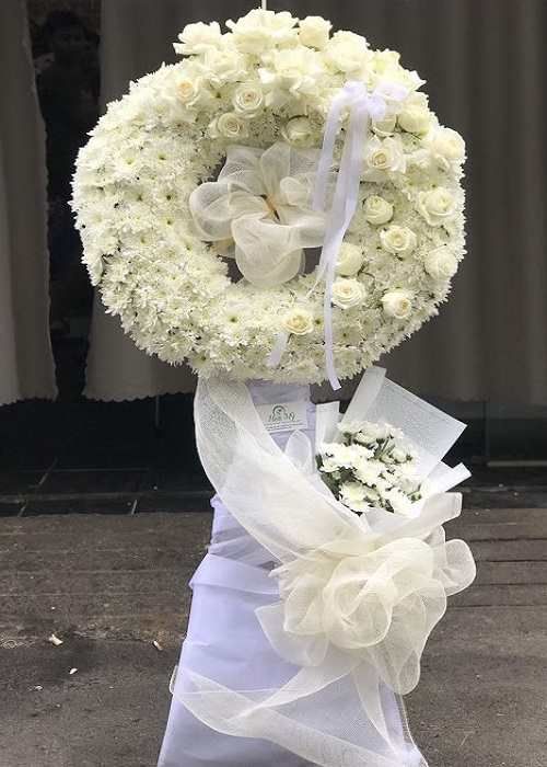 Vòng hoa tiễn biệt được kết từ hoa hồng trắng, cúc trắng và lan hồ điệp tinh khôi – như một lời tiễn đưa nhẹ nhàng và thuần khiết. Hình tròn viên mãn tượng trưng cho vòng đời trọn vẹn, không tiếc nuối. Mọi chi tiết đều được chăm chút kỹ lưỡng, mang đến sự trang trọng, thanh lịch và đầy tính nhân văn cho khoảnh khắc chia xa.