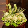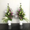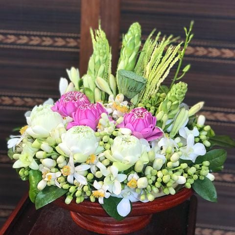 Mâm hoa được sắp xếp hài hòa với sắc sen trang nhã, gợi lên sự tinh khiết và tôn kính. Đây là lựa chọn lý tưởng để dâng lễ Phật, cúng rằm, mùng một hoặc trong các dịp lễ Vu Lan, cầu an, cầu siêu. Thiết kế mang đến cảm giác thanh tịnh, giúp không gian thờ cúng thêm phần trang trọng và thành kính.