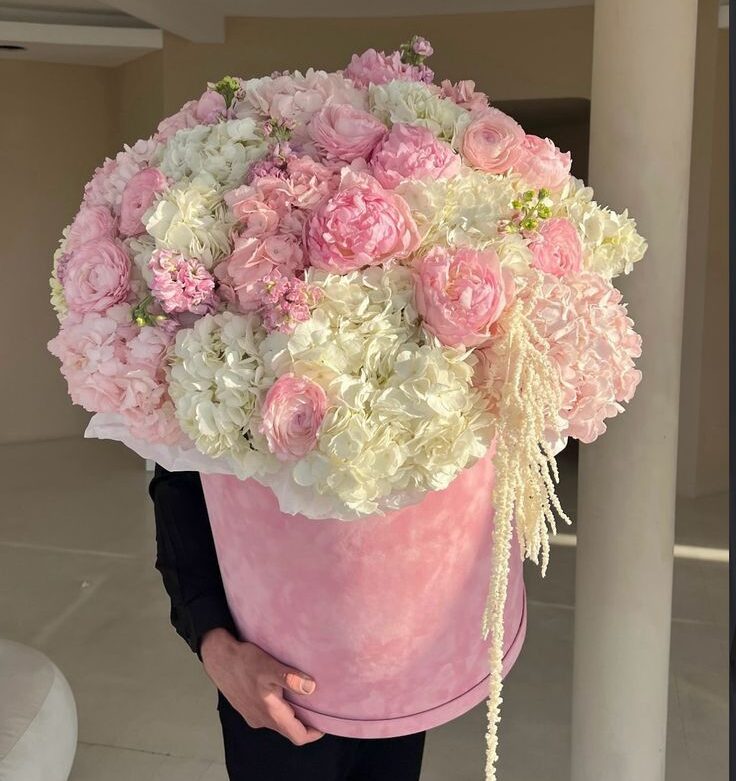 Hộp hoa sang trọng với những đóa hồng kiêu sa, cẩm tú cầu trắng muốt và điểm xuyết các loài hoa hồng phấn mềm mại. Sắc màu chuyển nhẹ từ trắng tinh khôi sang hồng ngọt ngào, gợi lên hình ảnh của mây chiều và ánh nắng dịu. Món quà tượng trưng cho tình yêu thuần khiết, sự trân trọng và lời chúc hạnh phúc viên mãn.