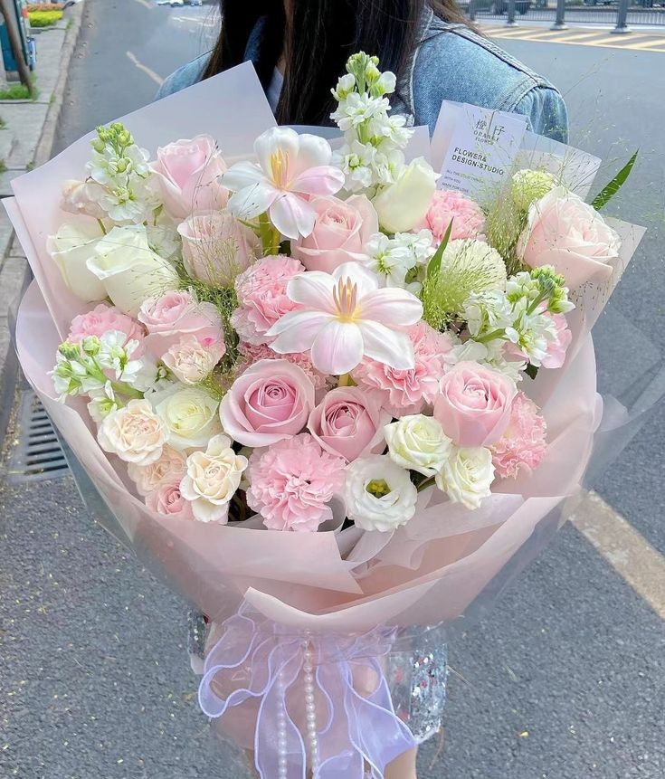 Bó hoa là sự hòa quyện dịu dàng của sắc trắng tinh khôi và những tầng hồng phớt nhẹ nhàng, tạo nên cảm giác trong trẻo và thuần khiết như một áng mây đầu ngày. Không cầu kỳ, không phô trương – bó hoa toát lên vẻ tinh tế một cách tự nhiên, gợi cảm giác yêu thương êm đềm và tràn đầy thanh khí.